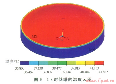 1s時的溫度分布可以看到穹頂已經(jīng)獲得了初始的熱邊界條件,穹頂外表面是夏季最熱天的環(huán)境溫度41℃(圖5)。