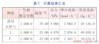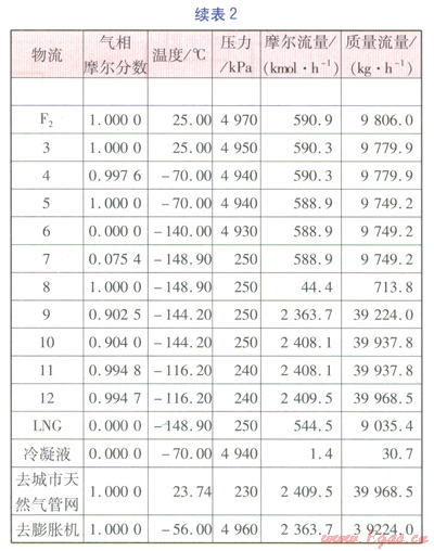 調(diào)試流程直至收斂,得到計(jì)算結(jié)果見表2,LNG及去城市管網(wǎng)天然氣組成見表3。