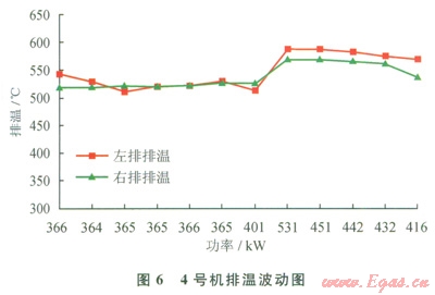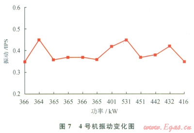 在10口井的試驗(yàn)中,GTI混合燃料技術(shù)基本能滿足各個(gè)工況下鉆機(jī)對柴油機(jī)動(dòng)力的需求,對突加負(fù)荷的滿足能力較強(qiáng),當(dāng)運(yùn)行參數(shù)超過設(shè)定的安全值,能立即平穩(wěn)地轉(zhuǎn)為純柴油模式,保證動(dòng)力供給的連續(xù)性。起下鉆工況下,4號(hào)柴油機(jī)最低排溫511℃,最高排溫576℃,均在安全范圍內(nèi)。其排溫曲線和振動(dòng)變化如圖6、7所示。