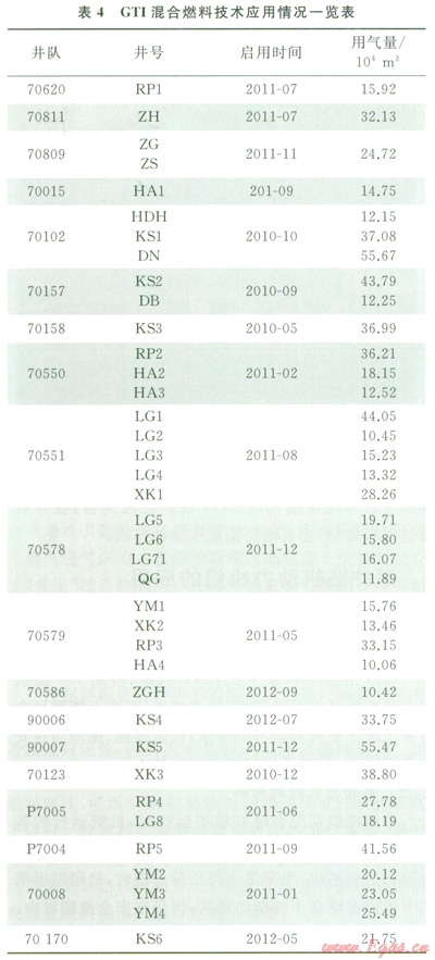 GTI混合燃料技術(shù)性能穩(wěn)定,安全性高,具有良好的經(jīng)濟(jì)效益。目前,GTI技術(shù)應(yīng)用21個(gè)鉆井隊(duì),應(yīng)用井?dāng)?shù)40口,累計(jì)用氣量達(dá)935×104m3。GTI混合燃料技術(shù)應(yīng)用情況如表4所示。
