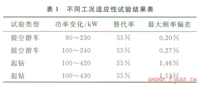 3)提空游車適用性試驗(yàn)結(jié)果分析。試驗(yàn)井深4000m,單機(jī)功率從l00kW突加至230kW,發(fā)電機(jī)組在雙燃料模式下頻率波動(dòng)0.2%,相對于柴油模式0.2%的頻率波動(dòng),無影響。起鉆試驗(yàn)單機(jī)功率從l00kW突加至430kW,發(fā)電機(jī)組在雙燃料模式下頻率波動(dòng)1.53%,相對于柴油模式1.2%的頻率波動(dòng)有所增加,但不影響鉆井工作,試驗(yàn)結(jié)果如表1所示。