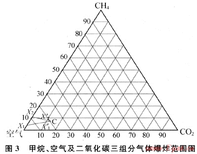 根據(jù)以上實驗結果,繪制了CH4、CO2及空氣3組分氣體爆炸范圍圖,如圖3所示。經(jīng)檢測得知可燃氣CH4在含有10%(體積分數(shù)) CO2的混合空氣中的爆炸下限和上限分別為(X1、X2)、(X1’、X2’),三角形X1X2C即為CH4、CO2及空氣3組分氣體爆炸范圍。