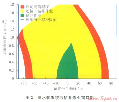 鉆井隔水管系統(tǒng)鉆井作業(yè)窗口分析與確定的目的是明確進(jìn)行正常鉆井作業(yè)、連接非鉆井作業(yè)和解脫作業(yè)的環(huán)境載荷條件和鉆井平臺(tái)偏移范圍,形成相應(yīng)的綠圈、黃圈和紅圈,可為隔水管的連接作業(yè)提供指導(dǎo)。