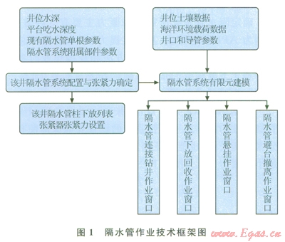 從指導(dǎo)隔水管作業(yè)的角度出發(fā),作業(yè)技術(shù)研究的目的是要確定鉆井作業(yè)窗口和隔水管下放/回收窗口和隔水管懸掛作業(yè)窗口,也就是確定各種作業(yè)條件下的容許作業(yè)參數(shù)和環(huán)境條件,為隔水管的安全作業(yè)提供參考。深水鉆井隔水管作業(yè)技術(shù)框架如圖l所示。