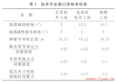 2)隔水管作業(yè)技術(shù)研究主要是依據(jù)設(shè)計(jì)得到的管柱排列和張緊力,結(jié)合給定海域的海況條件和依托平臺(tái)的具體情況,同時(shí)也要考慮井口、導(dǎo)管參數(shù)以及土壤條件,確定隔水管鉆井作業(yè)窗口、下放/回收作業(yè)窗口和硬懸掛作業(yè)窗口,確定各個(gè)窗口對(duì)應(yīng)的極限作業(yè)參數(shù)與極限環(huán)境條件,保證隔水管作業(yè)的安全性。