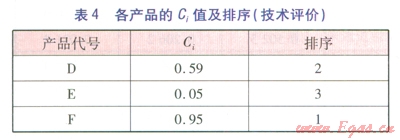 若不考慮經(jīng)濟(jì)性的影響,單從技術(shù)方面對產(chǎn)品進(jìn)行評價,按同樣方法進(jìn)行計算,得到各產(chǎn)品的Ci值及排序見表4??梢?,技術(shù)排序與綜合評價排序相同,但是,各產(chǎn)品的技術(shù)優(yōu)劣勢很明確,F產(chǎn)品在技術(shù)上明顯優(yōu)于D產(chǎn)品。