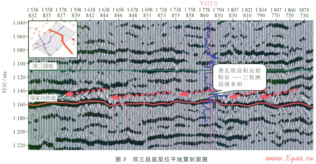 地震相主要是通過地震反射外部幾何形態(tài)、內(nèi)部反射結(jié)構(gòu)、振幅、連續(xù)性、波形排列以及視頻率等特征進行識別與劃分。在區(qū)域最大湖泛面(須三段底)拉平地震剖面上,對于整個須二段可見清晰的三角洲前緣亞相疊瓦狀前積反射結(jié)構(gòu),兩個平行的反射層之間存在幾組傾斜的、疊瓦狀排列的同相軸(圖3),可作為判斷物源方向的依據(jù)。但對該區(qū)須二上亞段20~30ms小時窗內(nèi)(厚度50~85m),地震微相特征不明顯,后續(xù)沉積微相的劃分需要借助地震屬性的分析。