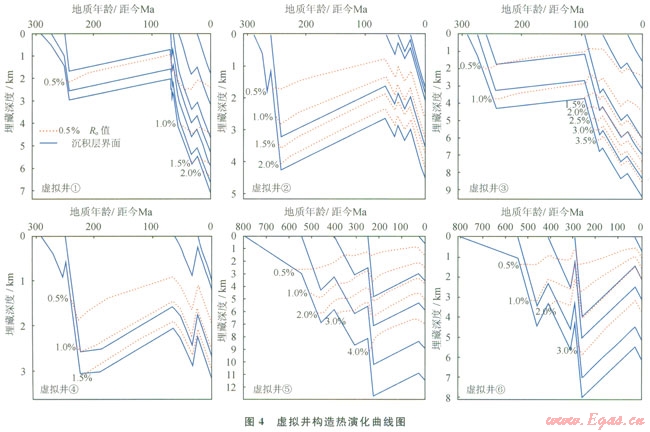 在盆地構造熱演化史研究中,經(jīng)典和主要的盆地構造熱演化史研究方法有:有機質(zhì)成熟度指標[23-24]、礦物裂變徑跡、單井EASY%R。熱反演法[25-28]及(UTh)/He年齡法[29]等,實際研究中基于所能獲得的資料豐富程度及研究目的不同采用不同的方法。