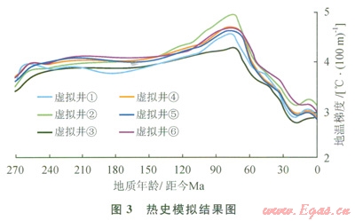 熱史模擬結果(圖3)表明:南黃海古地溫梯度自二疊系沉積開始至上白堊紀(距今約70Ma)一直呈上升趨勢,最高至5.0℃/l00m,其間有2次快速升高(距今270~260Ma和130~70Ma)和1個平穩(wěn)期(距今260~130Ma),平穩(wěn)期地溫梯度在4.0℃/l00m左右,70Ma至今地溫梯度總體呈下降趨勢,現(xiàn)今地溫梯度最低,為3.0℃/l00m左右;在最高地溫梯度處(距今約70Ma),各虛擬井的數(shù)值差別最大,最大差別可達1.0℃/l00m;新近紀和第四紀沉積對古生界烴源巖的深埋增熟作用由于該時期地溫梯度的降低而減弱。