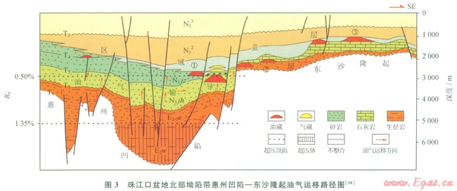 珠江口盆地北部坳陷帶(圖2、3)處于南海北部大陸邊緣陸架上,盆地基底是燕山期島弧帶,盆地形成經(jīng)歷古近紀(jì)斷陷、新近紀(jì)坳陷與新構(gòu)造期3個階段。其中始新統(tǒng)文昌組沉積末期盆地受到強烈改造,地層遭受較大規(guī)模剝蝕。盆地二級構(gòu)造單元有珠一坳陷和珠三坳陷等。三級構(gòu)造單元包括10多個凹陷和凸起。凹陷是潛在的生烴單元,但都比較破碎,多數(shù)凹陷被次級凸起進(jìn)一步分隔成多個洼陷。洼陷才是最基本的生烴單元,多數(shù)洼陷呈“肉(古近系)厚皮(新近系)薄”特征。烴源巖為始新統(tǒng)文昌組中深湖相泥巖、漸新統(tǒng)恩平組湖沼相煤系地層[3],部分凹陷可能殘留有中生代海相—海陸過渡相烴源巖。該區(qū)域地溫梯度及大地?zé)崃髦捣謩e為36.6±6.0℃/km和66.1±8mW/m2[15],屬于熱盆。始新統(tǒng)文昌組中深湖相泥巖烴源巖有機碳含量介于0.50%~4.88%,平均為1.22%,以偏腐泥混合型干酪根為主,埋藏深度處在生油窗范圍,主要生油,是主力生油巖;恩平組因埋藏淺、熱演化程度低在珠一坳陷生成少量石油,在珠三坳陷生成部分天然氣。因此主力烴源巖為始新統(tǒng)文昌組,比較單一,決定了以油為主的縱向分布特征[3]。已發(fā)現(xiàn)的生油洼陷有惠州26洼、陸豐l3洼、番禺4洼、恩平l7洼、珠三坳陷文昌B洼等??v向上石油分布在基底組合、始新統(tǒng)文昌組—恩平組下組合、漸新統(tǒng)珠海組—下中新統(tǒng)珠江組中組合、中上新統(tǒng)粵海組—萬山組上組合。珠江口盆地北部新構(gòu)造活動劇烈,石油晚期運移活躍,目前發(fā)現(xiàn)的石油主要集中在中組合,其他組合是下一步的油氣勘探方向。