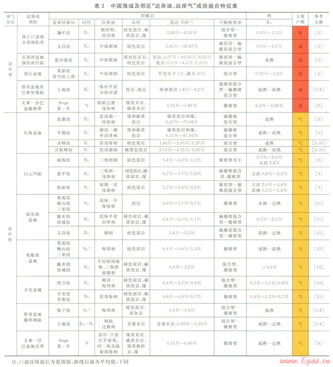 中國東南沿海油氣區(qū)指東海海域和南海海域油氣區(qū)。油氣區(qū)內(nèi)盆地的基底是印支、燕山期造山帶,盆地屬于邊緣海盆地,結(jié)構(gòu)呈斷陷—坳陷,充填的主要地層為新生界(局部有中生代殘留盆地)。盆地的烴源巖時代相對單一,主要發(fā)育一套古近紀(jì)—新近紀(jì)地層[2-13],在不同盆地生油氣性質(zhì)不同,從油氣田分布看,可以分成近岸原油帶和遠(yuǎn)岸天然氣帶(圖1、表2)。
