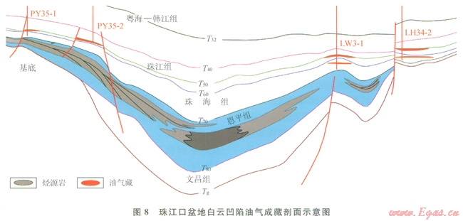 珠江口盆地位于南海北部大陸邊緣東段,白云凹陷位于珠江口盆地南部坳陷帶珠二坳陷內(nèi),凹陷基底是燕山期島弧帶,凹陷內(nèi)新生代地層發(fā)育。白云凹陷演化歷經(jīng)了古近紀(jì)裂陷期,早、中中新世坳陷期和晚中新世以來的新構(gòu)造期[20]。白云凹陷發(fā)育始新統(tǒng)文昌組中深湖相泥巖、下漸新統(tǒng)恩平組海陸過渡相煤系地層與海灣相泥巖、上漸新統(tǒng)珠海組海相泥巖共計3套烴源巖(圖8)。恩平組海陸過渡相煤系地層海灣相泥巖是主力烴源巖,其中暗色泥巖總有機碳含量介于1.0%~l.5%,展布規(guī)模大,烴源巖母質(zhì)類型多為偏腐殖混合型及腐殖型。恩平組煤系烴源巖主要發(fā)育在凹陷北部斜坡區(qū)域,展布范圍超過5000km2,煤層發(fā)育,在PY33-1-1井恩平組有煤20層,累計厚度為22.98m[18]。文昌組中深湖相烴源巖有機碳含量介于0.50%~4.88%,平均為1.22%,以偏腐泥混合型十酪根為主。白云凹陷位于洋陸過渡區(qū),地溫梯度及大地?zé)崃髦捣謩e高達(dá)4.5℃/100m和77.5mW/m2[15],屬于超熱盆。白云凹陷恩平組底部烴源巖現(xiàn)今成熟度在凹陷中心部位R。為0.5%~2.0%,主凹最深處尺。達(dá)到2.0%,在凹陷邊緣部位R。介于0.5%~0.7%;有機質(zhì)熱演化多處在成熟~高熟凝析油及生氣階段,其烴類產(chǎn)物以大量天然氣及少量輕質(zhì)油及凝析油為主;主洼以生氣為主,周邊的衛(wèi)星洼陷埋藏淺,以生油為主。此外,文昌組烴源巖在白云凹陷斜坡帶現(xiàn)今R。為2.1%,表明文昌組烴源巖也已經(jīng)達(dá)到生氣階段。白云凹陷及其鄰區(qū)發(fā)育漸新統(tǒng)儲蓋組合和新近系儲蓋組合,油氣勘探都有重要發(fā)現(xiàn);目前的油氣勘探發(fā)現(xiàn)多在珠江組;預(yù)測主力儲蓋組合為恩平組與珠海組。