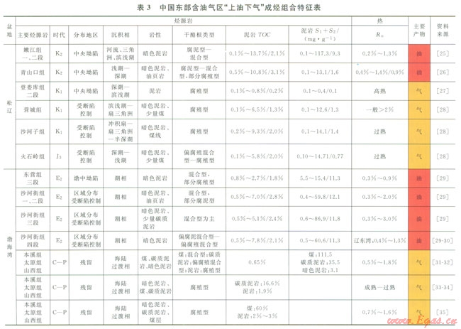 我國陸地區(qū)東部油氣區(qū)包括東北吉黑中新生代裂谷區(qū)(主要包括松遼盆地、海拉爾盆地、二連盆地、大楊樹盆地、三江盆地等,主要形成于晚侏羅世—白堊紀(jì);僅依蘭—伊通地塹系形成于古近紀(jì))、渤海灣盆地(主要包括下遼河坳陷、遼東灣坳陷、渤中坳陷、濟陽坳陷、黃驊坳陷、冀中坳陷、臨清坳陷、埕寧隆起、滄縣隆起、內(nèi)黃隆起等,主體形成于古近紀(jì))、南華北盆地、南襄盆地、江漢盆地、北黃海盆地和蘇北—南黃海盆地等(圖1)。這些盆地基底為克拉通基底或海西—印支褶皺區(qū)。盆地成盆期及其期次不同、各期盆地原型也不同,經(jīng)歷的改造作用差異巨大,多為殘疊甕地,即多期原型盆地的殘余疊合在一起,烴源巖發(fā)育程度不同(表3)。受區(qū)域熱流場和埋藏作用的綜合控制,烴源巖經(jīng)受不同的熱作用,導(dǎo)致下部層系烴源巖以生氣為主,上部層系烴源巖以生油為主,形成“下氣上油”兩類成烴模式。如松遼盆地白堊系下部生成天然氣、白堊系上部生成巨量石油,呈現(xiàn)出下生氣、上生油的格局;渤海灣盆地前新生代殘余盆地生成天然氣、古近系盆地生成巨量石油,也呈現(xiàn)出“下氣上油”的特點。