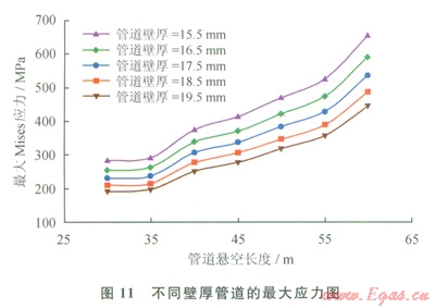 3)以上工況,把管道壁厚分別改變?yōu)?span lang="EN-US">15.5mm、16.5mm、18.5mm、19.5mm,計(jì)算管道最大Mises應(yīng)力的變化情況(圖11),最大Mises應(yīng)力隨壁厚的增加而下降,安全裕度隨壁厚增加而升高。為此,管道壁厚的增加量不能太大,若壁厚過大,為保持管道質(zhì)量不變,必須減少管徑,這會(huì)影響管道輸量;若要保持管道內(nèi)徑不變,壁厚增加太多,勢必使單位管段的耗材和質(zhì)量劇增,以至管道豎向受力增大。本文僅對管道壁厚作適度調(diào)整以觀察受力與管材結(jié)構(gòu)變化的關(guān)聯(lián)性,為碳纖維強(qiáng)固提供理論依據(jù)。碳纖維質(zhì)量小于鋼管,自身抗拉能力強(qiáng),對擘厚影響較小,這些特點(diǎn)可滿足上述分析的需要:即重量變動(dòng)不大、適當(dāng)改變材料組成及結(jié)構(gòu)、提高抗彎能力。