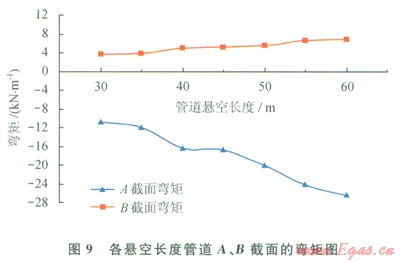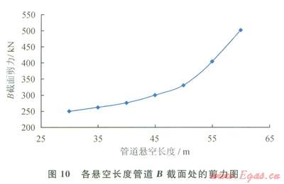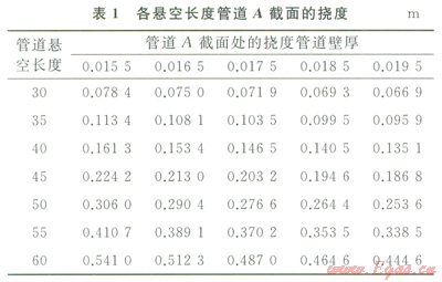 2)保持其他工況參數(shù)不變,改變懸空長度分別為35m、40m、45m、50m、55m、60m時(shí),汁算管道最大應(yīng)力、彎矩和撓度(見圖8~10和表l)。可見:截面A處撓度最大,截面B處剪力最大,管道易在截面B處發(fā)生剪力破壞。當(dāng)懸空長度為55m時(shí),管道已接近失效上限,仍處于安全范圍。60m時(shí),管道最大應(yīng)力大于485MPa,此時(shí)管道失穩(wěn),超出安全極限,理論上已失效。