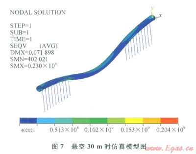 懸空30m時(shí),仿真結(jié)果如圖7,在沿管軸方向(圖中x方向)的對稱中心處管道變形位移最大,在兩固支端、埋地與懸空的過渡處、對稱中心處應(yīng)力集中較明顯,沿豎直方向(圖7中y方向)管道上部應(yīng)力集中比管道下部明顯,最大應(yīng)力為230MPa,小于屈服極限485MPa,所以管道處于安全范圍內(nèi)。