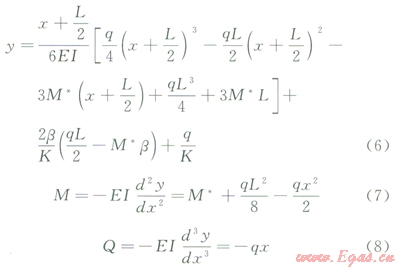 懸空段L:受埋地段兩端的拉伸、懸空與埋地過渡處下滑土的剪切、輸送介質(zhì)重量和管道白重等力的作用。通過力學(xué)等效簡化,該段為當(dāng)量軸向力(S0,)、彎矩(M0),剪力(Q0)、上部均布載荷(q)作用的大撓度梁。