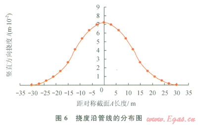 1)圖5、6表示了現(xiàn)場實(shí)際懸空長度為30m時(shí),應(yīng)力和撓度沿管線的分布情況,可見Mises應(yīng)力和豎直方向應(yīng)力在±15m處最大,而最大撓度出現(xiàn)在模型C-C處,也就是懸空水平對稱處。