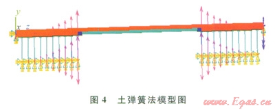 建立有限元物理模型時(shí),將埋地管段所受到土壤支反力用一定間距的若干根彈簧代替,彈簧與管下表面呈點(diǎn)一面接觸。合理選取埋地管段長度,使管模型兩端不受懸空段的影響,從而實(shí)現(xiàn)管兩端的固支模型,一般工程上取單側(cè)埋地段長度為懸空段長度的l/2,這時(shí)管兩端可近似為固支[10](圖4)。