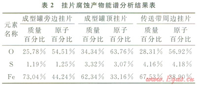 2)通過掃描電鏡觀察,發(fā)現(xiàn)腐蝕掛片表面形成片狀腐蝕產(chǎn)物;能譜顯示腐蝕產(chǎn)物主要含Fe、O元素和少量S元素。分析其腐蝕機(jī)理,腐蝕產(chǎn)物主要呵能是FeOOH、FeSO4、Fe2O3和Fe3O4。