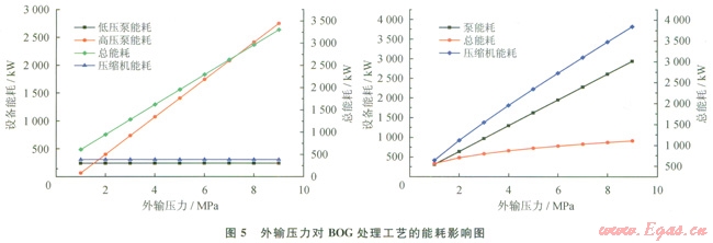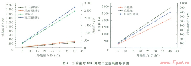1)BOG再冷凝液化工藝的能耗均小于BOG直接壓縮工藝的能耗。針對2種BOG處理工藝,外輸量的改變幾乎不影響再冷凝器的節(jié)能效果,但當BOG量較大時,BOG再冷凝液化工藝的節(jié)能效果更顯著。