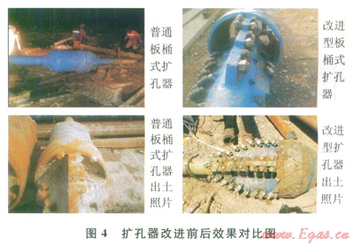 2)采用改進(jìn)型板桶式擴(kuò)孔器,提高了擴(kuò)孔效率,降低了施工風(fēng)險(xiǎn)(圖4)。采用新擴(kuò)孔器后,在Æ711mm-B管道穿越四級(jí)擴(kuò)孔施工中均是一次性完成了擴(kuò)孔,出土后的擴(kuò)孔器磨損很小,擴(kuò)孔效果極好。根據(jù)B管的擴(kuò)孔經(jīng)驗(yàn),在改進(jìn)擴(kuò)孔器切割方式的前提下,Æ711mm-A線進(jìn)一步優(yōu)化了擴(kuò)孔器水嘴的配置,使得鉆井液有效輔助切削,減小了擴(kuò)孔扭矩,將原來的四級(jí)擴(kuò)孔減少到三級(jí)(660.4mm、914.4mm、l066.8mm),提高了施工效率,節(jié)約了工期。