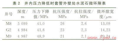 川中地區(qū)高壓天然氣井因Æl77.8mm尾管固井后,采用較低密度鉆井液替換井內(nèi)鉆井液鉆開(kāi)目的層而使作用在井內(nèi)套管的內(nèi)壓力大幅度降低。該區(qū)塊Æ177.8mm尾管固井時(shí)鉆井液密度約為2.20g/cm3,而下一次開(kāi)鉆鉆進(jìn)時(shí),鉆井液密度降至1.35g/cm3左右。M8、G2、M9井Æl77.8mm尾管固井,氣層封固質(zhì)量?jī)?yōu)良,候凝過(guò)程未發(fā)生氣竄,但井內(nèi)壓力大幅度下降后,喇叭口竄氣。該區(qū)塊水泥石楊氏模量10GPa,泊松比0.19,其余計(jì)算條件及結(jié)果如表2所示。以套管壁處水泥環(huán)徑向拉應(yīng)力達(dá)到抗拉強(qiáng)度為形成微環(huán)隙的臨界條件[7-8],由公式(3),計(jì)算出井內(nèi)壓力下降幅度超過(guò)40MPa后,3口井形成寬度l3.09~20.24mm的微環(huán)隙,密封能力顯著降低。