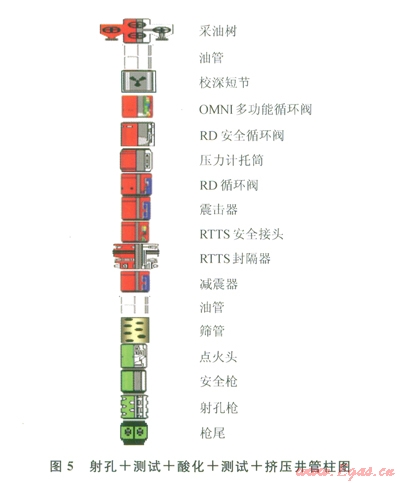 針對阿姆河右岸氣田的地質(zhì)特性以及酸壓增產(chǎn)的需求,結(jié)合以上4種典型的高溫高壓井測試管柱的技術(shù)特點(diǎn),本著簡單實(shí)用的原則,進(jìn)行優(yōu)化設(shè)計(jì)。得出以下管柱優(yōu)化方案——優(yōu)化管柱:射孔—測試—酸化—測試—擠壓井管柱(圖5)。