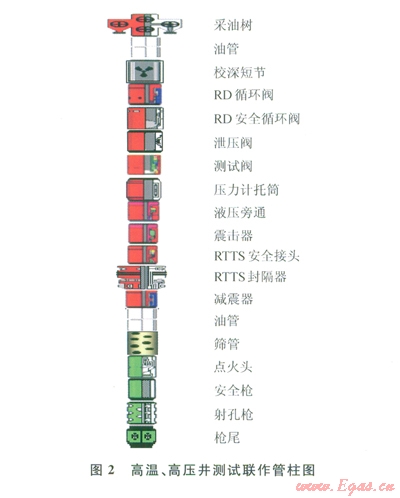 導(dǎo)向引鞋+射孔槍+點(diǎn)火頭+篩管+RTTS封隔器+安全接頭+液壓旁通閥+震擊器+壓力計(jì)托筒+LPR-N閥+放樣閥+RD安全循環(huán)閥+RD循環(huán)閥+校深短節(jié)+油管+采油樹(或井口控制頭)(圖2)。