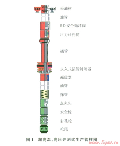 導(dǎo)向引鞋+射孔槍+點(diǎn)火頭+篩管+永久式插管封隔器+壓力計(jì)托筒+RD安全循環(huán)閥+油管+采油樹(圖1)。