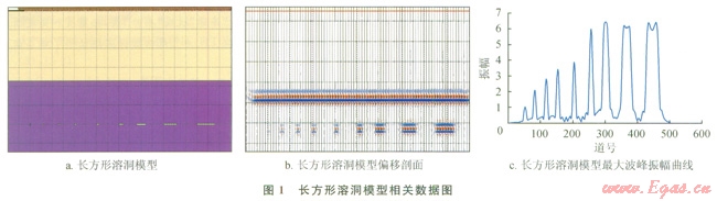 圖2-b是橢圓形溶洞偏移剖面,圖2-c為橢圓形溶洞最大波峰振幅曲線圖;圖3-b、圖3-c分別是菱形溶洞偏移剖面及最大波峰振幅曲線圖??梢钥吹?,無論是橢圓形模型還是菱形模型,隨著溶洞橫向尺度的增加最大波峰振幅是增加的,這和長方形溶洞正演模擬結(jié)果很相似。