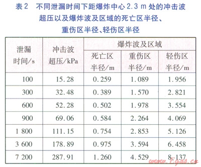 取環(huán)形縫隙泄漏流量為7.882×10-4m3/s規(guī)格為l5mm的燃?xì)夤艿?/font>[8],泄漏時(shí)間分別取l00、300、600、900、1800、3600、7200s。例:2.3m處Dp=52.28kPa,Dp=44kPa處>2.3m。沖擊波、爆炸波及區(qū)域破壞半徑采用不同方法計(jì)算,前者采用式(3)、(4)計(jì)算,后者采用式(5)~(7)計(jì)算。不同泄漏時(shí)間下距爆炸中心2.3m處(內(nèi)墻位置)的沖擊波超壓以及爆炸波及區(qū)域的死亡區(qū)半徑、重傷區(qū)半徑、輕傷區(qū)半徑見表2。