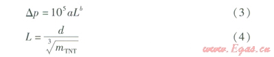 距爆炸中心d處的沖擊波超壓Dp的計(jì)算式為: