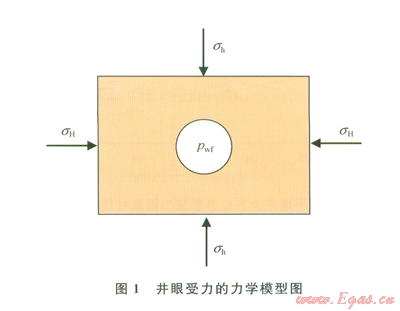 任何一口油氣井鉆開前原地應(yīng)力就已存在于地層巖石中,油氣井眼鉆開后,井內(nèi)流體壓力取代了被鉆巖層提供的支撐,無疑會引起井眼周圍巖石應(yīng)力的重新分布[21-22]。假設(shè)井眼周圍的地層為多孔彈性介質(zhì),其應(yīng)力分布可用以下力學(xué)模型求解:在無限大平面上,一圓孔受均勻的內(nèi)壓,而在這個(gè)平面的無限遠(yuǎn)處受兩個(gè)水平地應(yīng)力的作用,在垂直方向上受上覆巖層壓力作用,如圖l所示。由于井周地層應(yīng)力最大的點(diǎn)出現(xiàn)在井壁上[23],筆者僅給出了井壁上的應(yīng)力分布公式。直井井壁圍巖有效應(yīng)力為[23]: