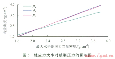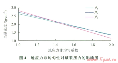 圖7為3種破裂壓力隨孔隙壓力的變化規(guī)律,計(jì)算時(shí)保持構(gòu)造應(yīng)力系數(shù)不變,只改變孔隙壓力的大小。當(dāng)?shù)貙涌紫秹毫Ξ?dāng)量密度由l.0g/cm3 上升到2.0g/cm3時(shí),3種破裂壓力都近似呈線性增大,但rc增長速率遠(yuǎn)小于ra和rb;當(dāng)孔隙壓力當(dāng)量密度小于1.5g/cm3時(shí),井壁首先發(fā)生A型剪切破裂;當(dāng)孔隙壓力當(dāng)量密度大于1.5g/cm3時(shí),首先發(fā)生拉伸破裂,即孔隙壓力越大發(fā)生拉伸破裂的可能性越大。