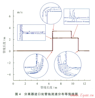 介質(zhì)在管道輸運過程中,由于其內(nèi)部流道的變化,局部的流速會遠遠高于整體流速,加之紊流作用影響,因此必定會加劇影響腐蝕速率。圖1所示管線的內(nèi)流場模擬結(jié)果見圖4、5所示。