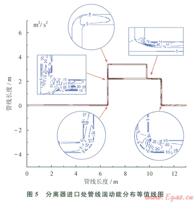 由于結(jié)構(gòu)的變化,彎頭迎著來流方向的內(nèi)弧面首先承受流體的沖刷,且流體速度達到最大,表明該位置的沖刷破壞危險性較高。與此同時,彎頭迎流側(cè)中上部位置形成局部湍流,湍流強度有明顯增強,湍流動能數(shù)在彎頭區(qū)域處達到最大值75m2/s2(圖5)。由于流體的慣性作用,流體沿著彎頭的弧度向前流動,正對著來流方向的彎頭外弧面上方的直管段位置,也承受了較大的沖刷作用;T形管內(nèi)最大流速發(fā)生在來流支管主流區(qū)域和與主流管道垂直的支管道內(nèi)遠離主流一側(cè)的區(qū)域,而與主流方向一樣的另一條支管道內(nèi)的流速則相對平緩。同時,渦流程度也在垂直主管道的支管道中靠近主流的一側(cè)以及支管道與主管道銜接部位的拐角處有了較大提高,湍流動能數(shù)也達到了該管線的峰值。