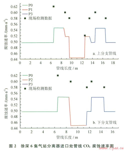 由計算數(shù)據(jù)可以得出,在管道的人口水平管道處,平均腐蝕速率保持在0.49mm/a,隨著流體介質(zhì)從L0管段流入Ll管段,管道由水平管段轉(zhuǎn)為鉛直管段,平均腐蝕速率升高,保持在0.55mm/a。在第一個T形管處管段的腐蝕速率有了一定程度的變小,L2與L4鉛直管線的腐蝕速率減至0.52mm/a,L3與L5水平管線的腐蝕速率減至0.45mm/a。在第二個T形管處介質(zhì)流體合流,腐蝕速率也增至0.50mm/a,在L7段處的管道鉛直下降,腐蝕速率升到0.55mm/a,最后在L8管段處達到穩(wěn)定。按照NACE標準RP-0775-91[12]中對腐蝕程度的規(guī)定,該條集氣站管線腐蝕率大于0.254mm/a,已發(fā)生極嚴重腐蝕。中國特種設(shè)備檢測研究院于2011年利用OLYMPUS 38DLPLUS超聲波測厚儀對該管線的重點管段處(彎頭及T形管)進行檢測,由于重點管段處的腐蝕情況略高于平均腐蝕預(yù)測率,故該模擬結(jié)果與現(xiàn)場工況的檢測結(jié)果較吻合[13],從而說明本文采用模擬方法是可行的,為下面繼續(xù)分析CO2分壓對腐蝕速率的影響奠定基礎(chǔ)。