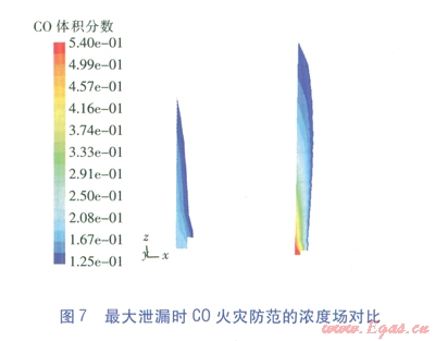 C0是CRG的主要叮燃組分,在12.5%~74.0%的爆炸極限范圍內(nèi)均可燃,且其密度與空氣相近,泄漏后較難快速散失,會混入地面空氣中產(chǎn)生橫向蔓延,因此研究考慮的C0防火控制體積分?jǐn)?shù)取其爆炸下限l2.5%,即低于該含量均屬安全。