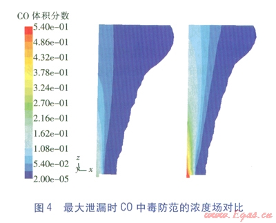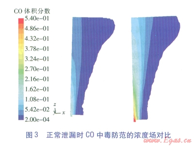 值得一提的是,火災(zāi)防范時只將爆炸極限列為危害區(qū)間,這符合不發(fā)生明火時的氣體冷態(tài)擴(kuò)散情況,但一旦發(fā)生燃燒,C0的濃度場將發(fā)生極大變化,還將產(chǎn)生對人員窒息的煙氣。FLUENT作為一款功能強(qiáng)大的軟件,也能模擬燃燒情況(俗稱熱態(tài)研究),但這將大大增加參數(shù)設(shè)定的復(fù)雜性和計算過程冗時性,這是工程計算力求避免的,但應(yīng)是理論研究的改進(jìn)方向。