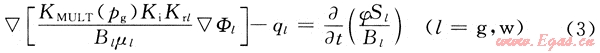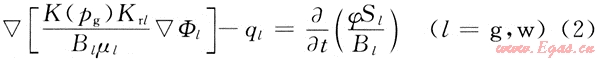 在滲流力學(xué)基礎(chǔ)上,從推廣的達(dá)西定律和黑油模型出發(fā)建立了三維氣、水兩相流考慮應(yīng)力敏感的非線性滲流數(shù)學(xué)模型[3~4],即