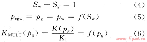 式(2)中包含了4個(gè)基本變量:pg、pw、Sg、Sw。為了完整地描述方程,還需3個(gè)附加的輔助關(guān)系式: