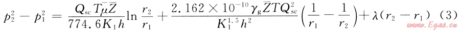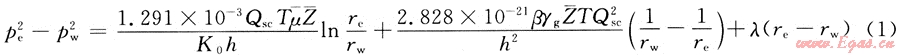 氣井的產(chǎn)量為Qsc,氣體的黏度為μ,氣體的偏差系數(shù)為Z,啟動(dòng)壓力梯度為λ,結(jié)合氣井的穩(wěn)態(tài)產(chǎn)能方程[3],同時(shí)考慮啟動(dòng)壓力梯度,有