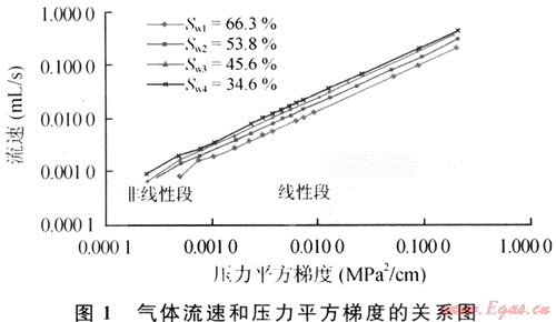 致密低滲透氣藏普遍具有低孔、低滲、束縛水飽和度高的特點(diǎn),由于細(xì)小孔隙喉道處水化膜的封堵作用,氣體滲流往往具有啟動(dòng)壓力梯度特征,作用于氣體兩端的壓力梯度要大于啟動(dòng)壓力梯度才能流動(dòng)[1];同時(shí)許多致密低滲透氣藏具有“應(yīng)力敏感”特征[2]。致密低滲透儲(chǔ)層巖心氣體低速滲流實(shí)驗(yàn)結(jié)果如圖1,在氣體流速和壓力平方梯度的關(guān)系圖上,線性段為達(dá)西滲流段,非線性段不通過坐標(biāo)原點(diǎn),和x軸的交點(diǎn)即為啟動(dòng)壓力梯度,儲(chǔ)層含水飽和度越高,啟動(dòng)壓力梯度作用才明顯。致密低滲透氣藏儲(chǔ)層滲透率隨有效應(yīng)力的變化如圖2??梢钥闯鲈诮祪?nèi)壓過程中,滲透率隨有效應(yīng)力的增大而減小,在儲(chǔ)層壓力恢復(fù)的過程,由于儲(chǔ)層發(fā)生了部分塑性變形,滲透率并不能恢復(fù)到初值。