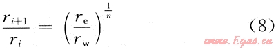 對(duì)于穩(wěn)態(tài)滲流的氣井,在離井較遠(yuǎn)的地方,壓力變化比較緩慢;而在井的附近,壓力下降卻非???。在用數(shù)值方法求解氣井產(chǎn)量時(shí),采用非均勻網(wǎng)格,即數(shù)值模擬柱坐標(biāo)系統(tǒng)中常用的沿徑向節(jié)點(diǎn)坐標(biāo)分布公式: