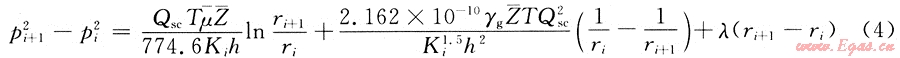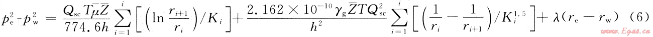 將i=3,4,…,n分別帶入式(5)中,可以得到n-2個(gè)類似的方程,并將這n-2個(gè)方程和式(3)和式(4)一起疊加,便可以得到考慮儲(chǔ)層變形和啟動(dòng)壓力梯度、非達(dá)西流動(dòng)的氣井產(chǎn)能方程: