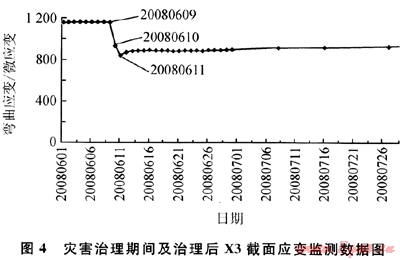2008年4月29日及2008年5月2日的兩次強(qiáng)降雨,使該管段附近滑坡體蠕滑加劇,在雨中和雨后尤其明顯。由于管道與滑坡體之間摩擦力相互作用,隨著該滑坡體的蠕滑加劇,坡體內(nèi)的管道也發(fā)生相應(yīng)的急劇應(yīng)變變化。隨著兩次強(qiáng)降雨的逐漸遠(yuǎn)去,滑坡體的蠕滑逐漸減緩并趨于穩(wěn)定,管道的應(yīng)變變化也趨于穩(wěn)定:2008年6月9日X3截面的彎曲應(yīng)變?yōu)?154.3個(gè)微應(yīng)變,較之于2008年5月8日,僅增加了21.2個(gè)微應(yīng)變。