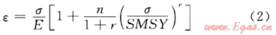 式中ε是工程應(yīng)變;σ是軸向應(yīng)力;E是彈性模量;n和r是Rarnberg-Qsgood參數(shù);SMYS是屈服應(yīng)力。