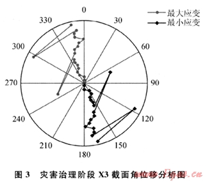 首先,管體應(yīng)力釋放要控制在合理范圍內(nèi)。一定長(zhǎng)度內(nèi)的管體應(yīng)變既然已發(fā)生,就很難再回復(fù)到初始狀態(tài);過(guò)度的釋放有可能會(huì)加劇該管段的力學(xué)損傷,甚至影響相鄰管段的穩(wěn)定和安全。換言之,管體的應(yīng)力釋放是以減緩并消弱災(zāi)害風(fēng)險(xiǎn)為目標(biāo)的,而不是像改線那樣去根除風(fēng)險(xiǎn)。治理階段的應(yīng)變動(dòng)態(tài)監(jiān)測(cè)可以控制應(yīng)力釋放的程度。其次,管體應(yīng)力的釋放要從低應(yīng)變區(qū)逐段向高應(yīng)變區(qū)迫近,而不是直接開(kāi)挖管道變形最為劇烈的管段,否則有可能導(dǎo)致管體在卸載后大幅度振蕩,加劇管體損傷。隨著管溝的逐段開(kāi)挖,該管段應(yīng)力分布也會(huì)發(fā)生即時(shí)變化,此時(shí)的應(yīng)變監(jiān)測(cè)數(shù)據(jù)可指導(dǎo)開(kāi)挖進(jìn)度和開(kāi)挖位置調(diào)整。最后,采用管道應(yīng)變監(jiān)測(cè)還可以獲得管線各監(jiān)測(cè)截面實(shí)時(shí)應(yīng)變極值的角度(如圖3),即角位移分析。角位移分析圖能夠清晰地表明最大應(yīng)力的方向、管道彎曲的方向,以及整個(gè)管段彎曲扭轉(zhuǎn)的狀態(tài)及趨勢(shì),進(jìn)而指導(dǎo)對(duì)管體進(jìn)行細(xì)微的挪移。