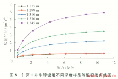 仁頁l井樣品等溫吸附實(shí)驗(yàn)共測(cè)定7個(gè)平衡壓力點(diǎn),每個(gè)壓力點(diǎn)達(dá)到平衡的時(shí)間約為12h,然后再增壓到下一個(gè)壓力點(diǎn),實(shí)驗(yàn)采用的甲烷氣濃度均大于99.999%。仁頁l井樣品等溫吸附曲線見圖8。